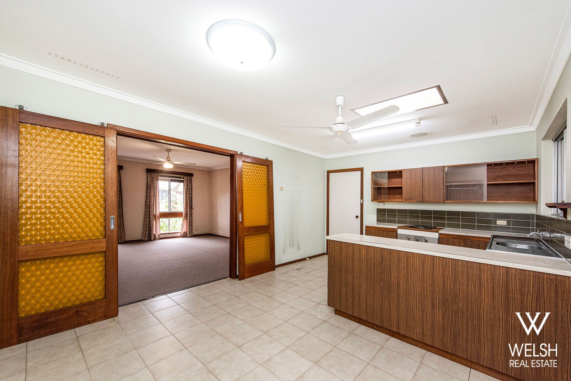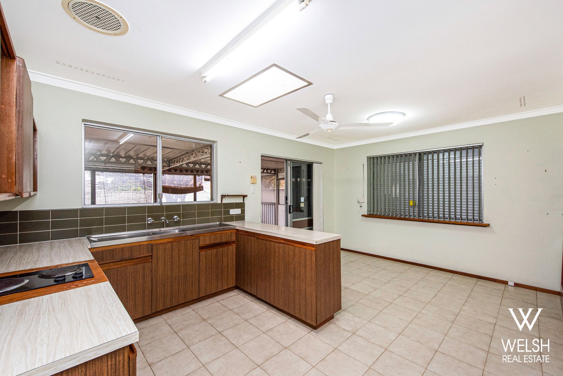 * Open plan kitchen and dining with ceiling fan